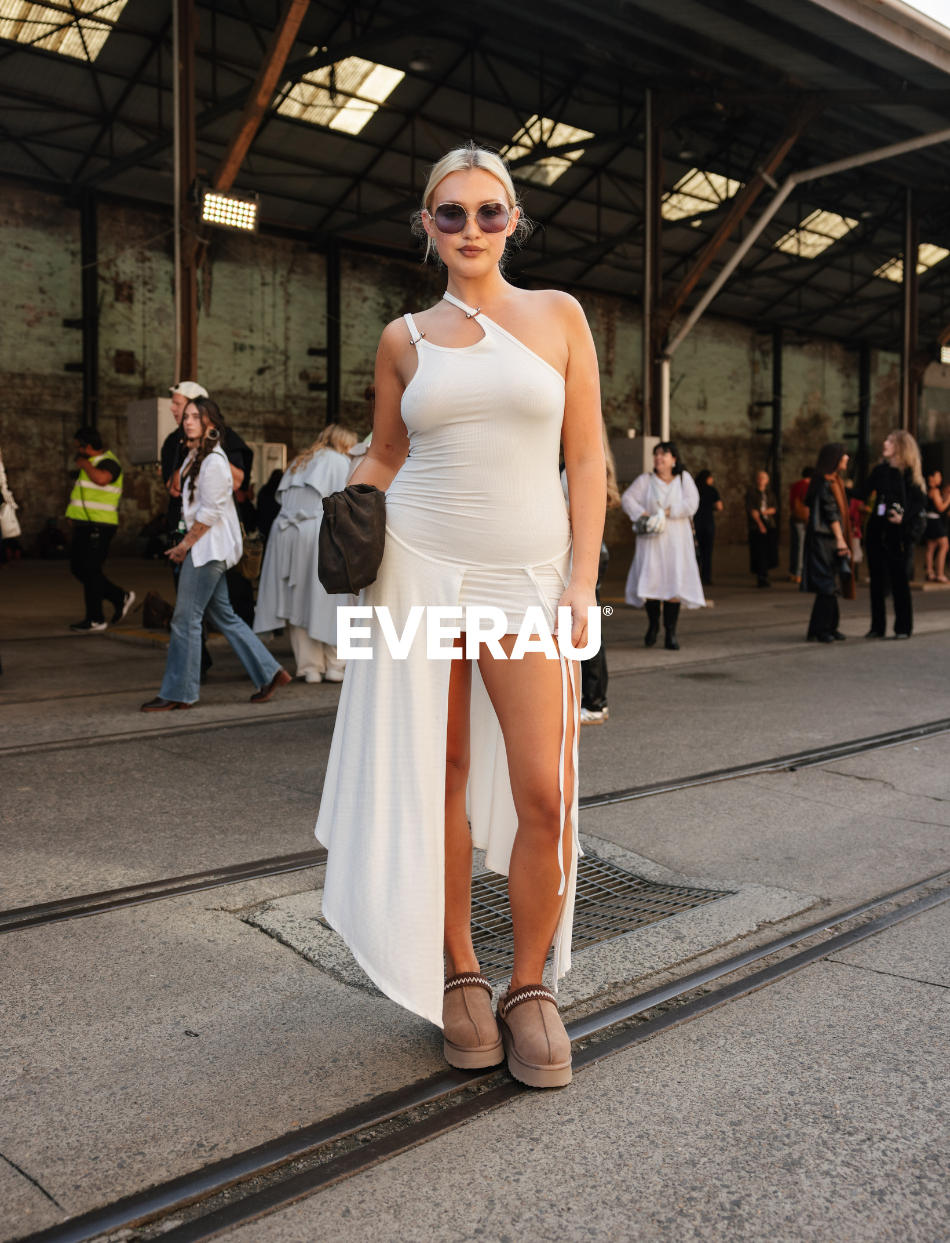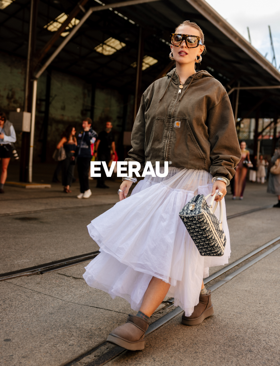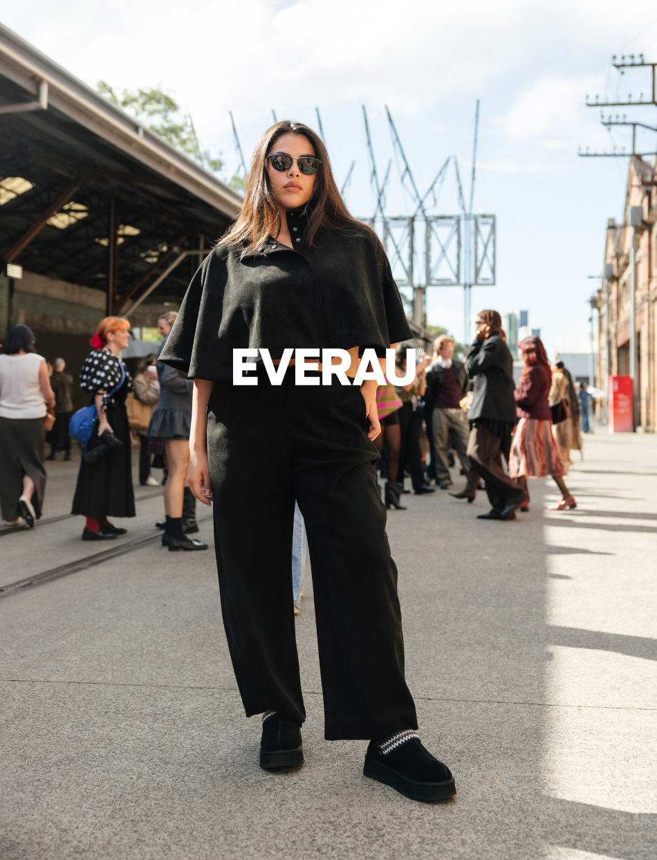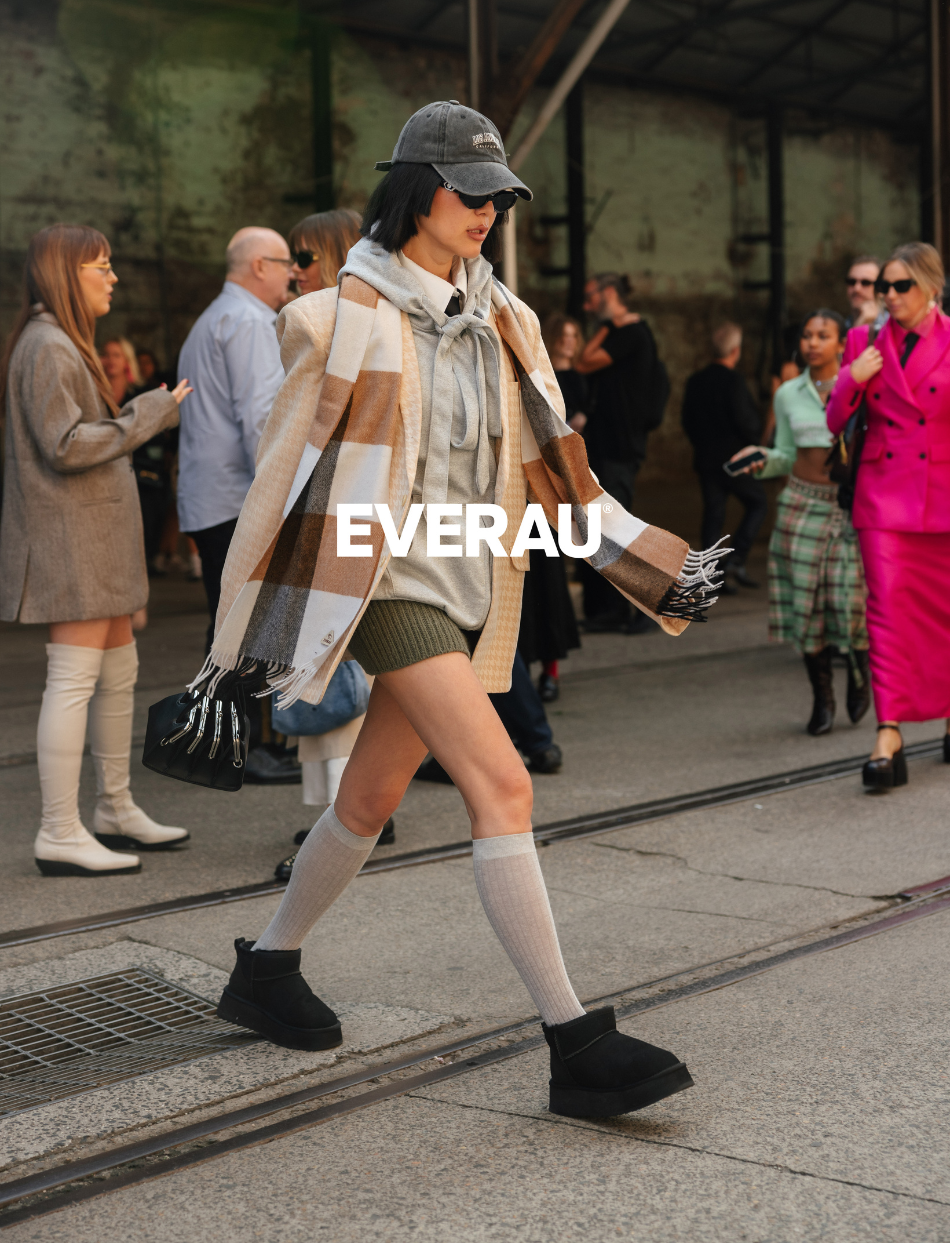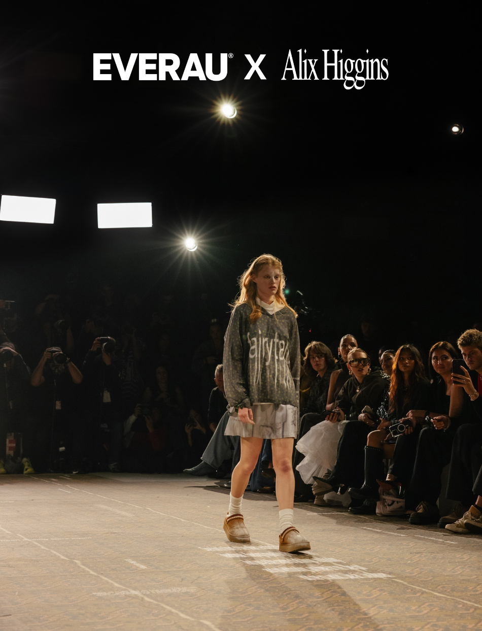 Na AFW marka EVERAU zadebiutowała kapsułą stworzoną z Alixem Higginsem: trzy customowe modele — Madison, Teddycozy i Maeve — w odcieniach glinianego brązu, z ręcznie malowanymi tulipanami Chloé Corkran. To wyraziste połączenie cyfrowej wrażliwości projektanta z komfortem i rzemiosłem EVERAU, które redefiniuje nowoczesny, australijski styl.